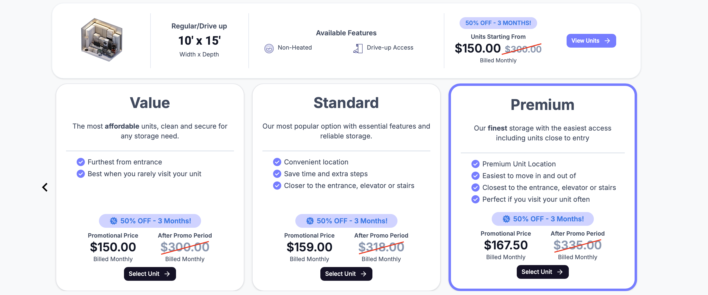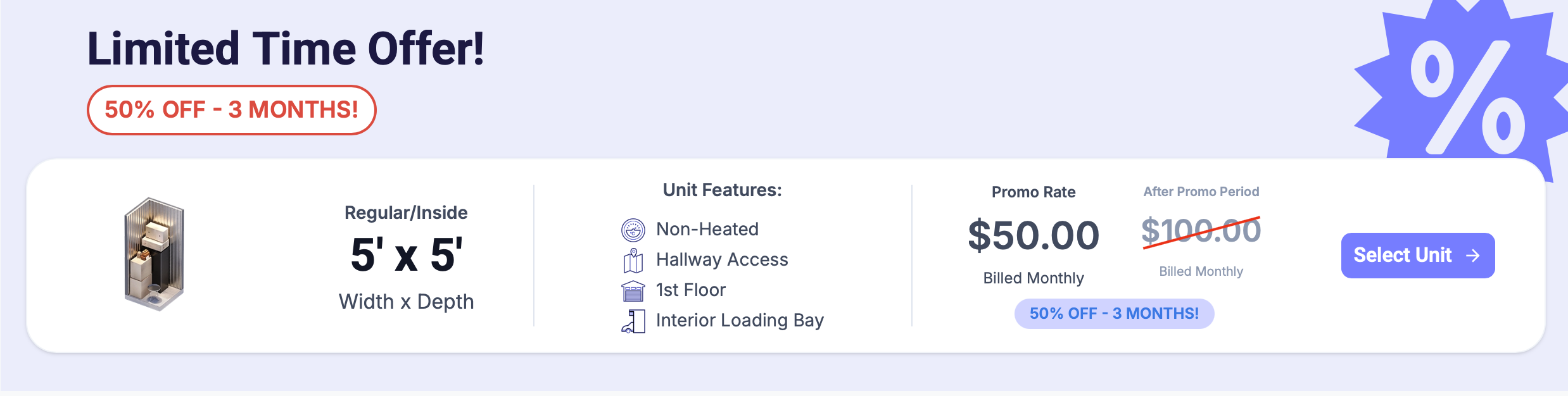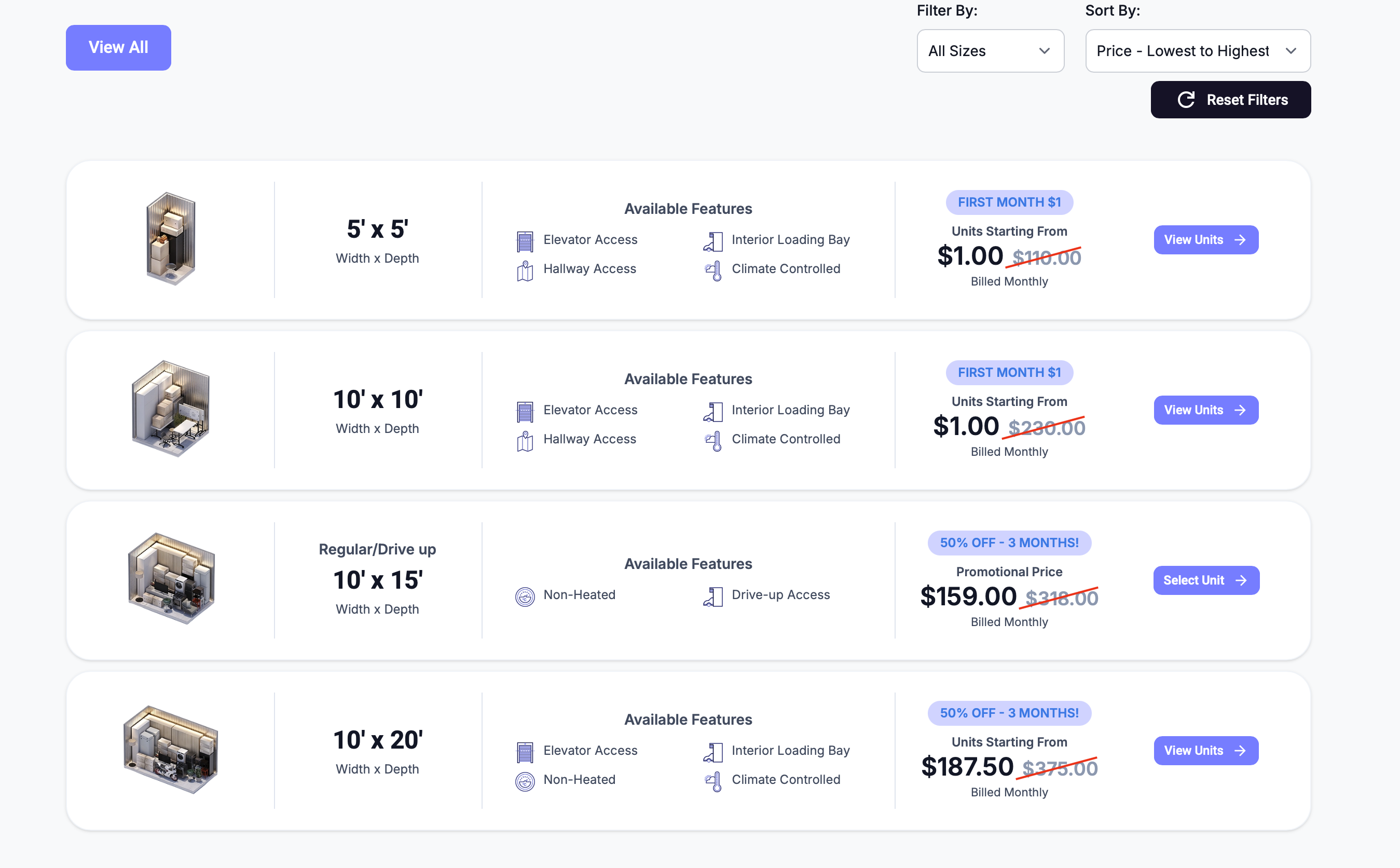Highlight specific unit types or sizes directly at the top of your unit grid. Perfect for showcasing featured deals or driving attention to priority inventory.